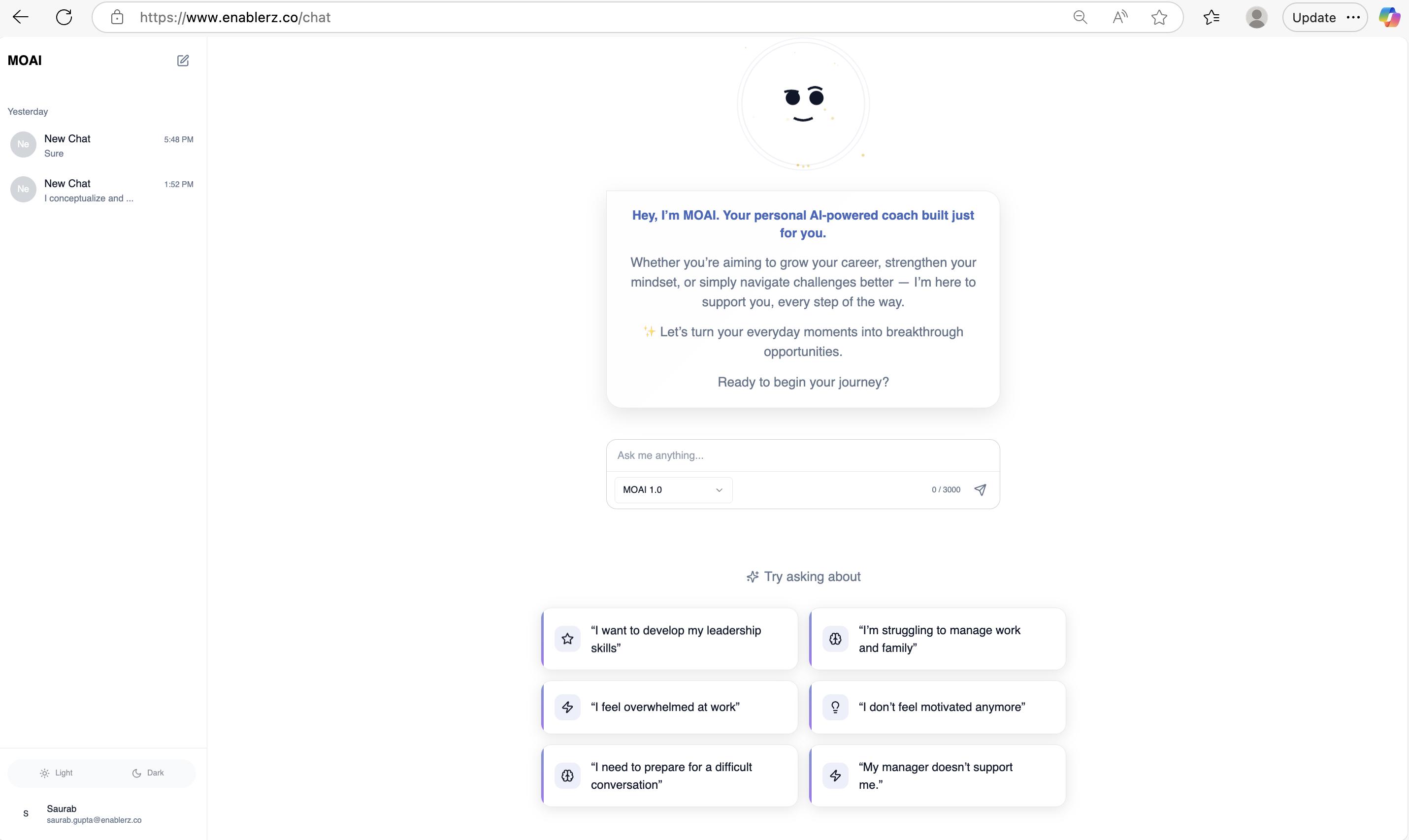 MOAI™ by Enablerz™ is an intelligent, human-centered AI coach built to democratize coaching for every individual in an organization.